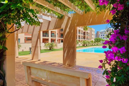 Covered parking and common areas with swimming pool, gardens and children's play area.